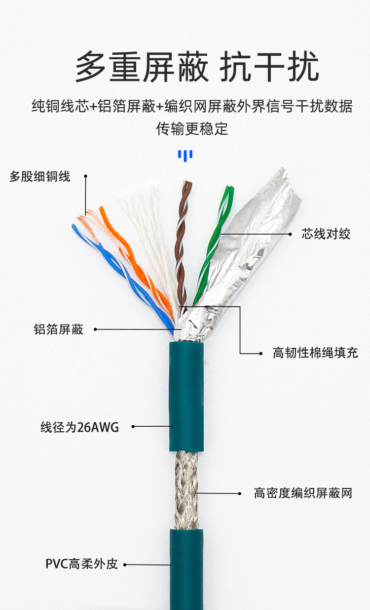 拖链网线采用多股纯铜丝绞合超五类网线,8芯4组双绞双屏蔽系列。适用于无强应力缓释或强制引导的自由连续往复运动下的安装,特别是工业环境使用下的,频繁弯曲场合需要屏蔽无差异和信号稳定的信息传导与监控,能有效抵抗电磁波干扰,布线方便、线缆利用率高、传输距离远、传输效果好、差分传输抗干扰能力强;适用于快速移动场合,布线方便、线缆利用率高、传输距离远、传输效果好、差分传输抗干扰能力强;耐弯曲寿命300万次以上(定制拖链网线耐弯曲次数可更高),适用于快速移动场合。抗撕裂,耐折.